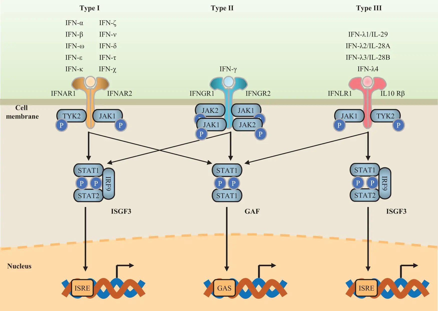 The interferon (IFN) family comprises three classes: type I (IFN-α/β/κ/ε/ω), type II (IFN-γ) and type III (IFN-λ1/2/3). Type I IFNs are rapidly produced upon viral or nucleic-acid sensing and signal through IFNAR1/2 to activate JAK-STAT1/2, inducing hundreds of interferon-stimulated genes (ISGs) that establish an antiviral state. Type II IFN, secreted by NK and Th1 cells, engages IFNGR1/2 to enhance macrophage activation and antigen presentation. Type III IFNs act locally at mucosal surfaces via IFNLR1/IL-10R2, also using STAT1/2. Beyond antiviral defense, IFNs modulate cell proliferation, apoptosis and tumor immune surveillance; dysregulation underlies chronic infection, autoimmunity and cancer immune evasion, making them central targets for IFN-based therapies and immune checkpoint strategies.