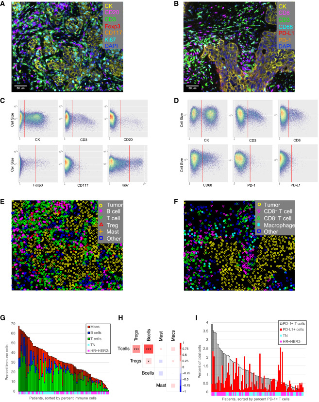 The study developed two multiplex immunofluorescence detection panels for analyzing immune cell infiltration in pre-treatment biopsy samples. Automated gating algorithms completed cell phenotype identification and generated phenotype maps for subsequent spatial analysis. Results showed significant differences in immune cell density among different tumors, with immune cells accounting for 1%-68% of total cells. Among these, T cells, B cells, and macrophages accounted for < 1%-42%, <1%-22%, and <1%-43% respectively. Significant correlations were found between T cells, B cells and Treg density, while macrophage and mast cell density showed no association with these lymphoid cell populations. Additionally, PD-1/PD-L1 staining levels also exhibited obvious heterogeneity, with PD-1+ T cells accounting for < 0.04%-3.9% of total cells, and PD-L1+ cells accounting for < 0.06%-2.6%.