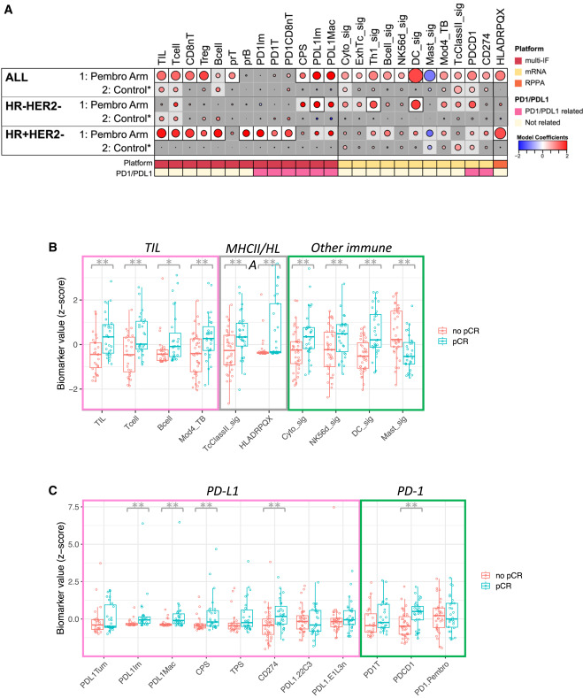 This study analyzed the predictive role of immune cell-related indicators on post-treatment pathological complete response (pCR) in different types of breast cancer patients in the pembrolizumab treatment group and conventional chemotherapy control group. Results showed that indicators predicting therapeutic efficacy in the pembrolizumab group were far more numerous than in the control group, and effective predictive indicators differed among different types of breast cancer. Specifically, among 20 immune cell-related indicators detected by multiplex immunofluorescence technology, 8 showed significant positive correlation with pembrolizumab treatment efficacy, including tumor-infiltrating lymphocytes (TILs), various T cells, two types of PD-L1-expressing cells, and PD-L1 CPS score. Higher values of these indicators were associated with greater probability of complete tumor disappearance, while in the control group, only TILs, T cells, and B cells showed weak associations with efficacy. Among the 18 gene-related indicators analyzed, 11 could only predict pembrolizumab treatment efficacy, covering gene signatures corresponding to various immune cells and encoding genes for PD-1 and PD-L1. Among 11 immune-related proteins detected by protein detection technology, only HLADRPQX protein was associated with pembrolizumab treatment efficacy. Among the overall 49 immune-related indicators, 20 could clearly predict immunotherapy efficacy, while the control group showed only 6 indicators with unclear associations with efficacy. Among these, dendritic cell-related gene signatures showed the best predictive efficacy, while mast cell-related gene signatures showed negative correlation with efficacy. In triple-negative breast cancer, 3 indicators could clearly predict immunotherapy efficacy and 8 indicators showed certain associations, mainly involving PD-L1-expressing immune cells and two gene signatures. In HR+HER2- breast cancer, 10 indicators could clearly predict efficacy and 9 indicators showed certain associations, including HLADRPQX protein and various immune cells. Importantly, these indicators predicting immunotherapy efficacy showed no association with treatment efficacy in their respective control groups.