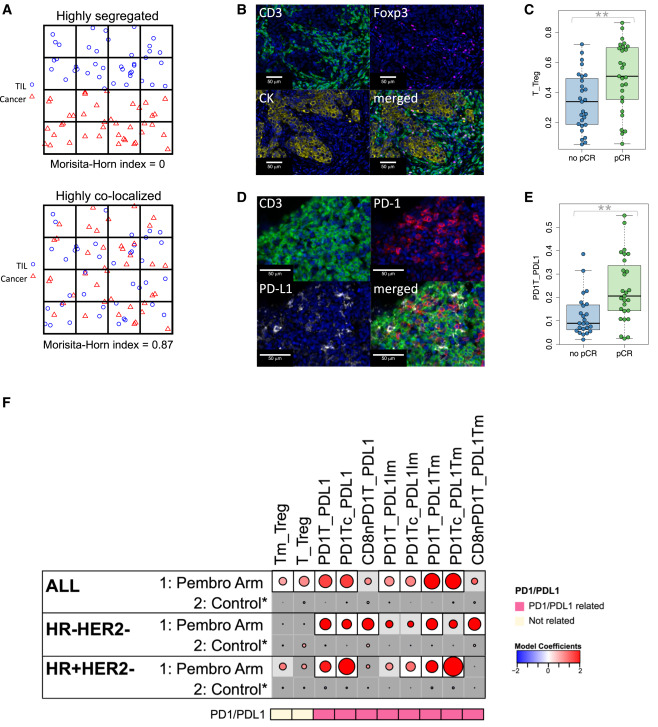 Specifically, the MH index measures the degree of colocalization between two cell types, ranging from 0 to 1. When two cell types are highly colocalized, the index approaches 1, and when highly separated, it approaches 0. The study calculated MH indices for 21 groups of cell types. High MH indices between T cells and regulatory T cells (Tregs) were significantly associated with pembrolizumab treatment response in the overall cohort. High MH indices between PD-1+ T cells and PD-L1+ cells were also associated with pCR. After multiple testing correction, 8 of 21 MH indices were associated with pembrolizumab treatment response in the overall cohort but not with the control group. Among these, 6 involved PD-1/PD-L1-related cell colocalization, and 3 showed significant interactions with treatment. When analyzed by receptor subtype, 7 MH indices were positively correlated with pembrolizumab group pCR and unrelated to the control group. These indices were all related to PD-1/PD-L1-related cell colocalization and were highly correlated with each other. Among these, colocalization of PD-1+ T cells with PD-L1+ cells or PD-L1+ tumor cells, and colocalization of PD-1+ CD8+ cytotoxic T cells with PD-L1+ cells were associated with pCR in both triple-negative and HR+HER2- tumors.