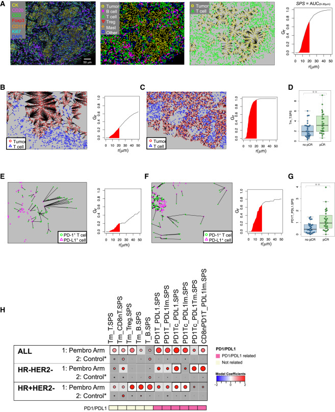The study further investigated spatial proximity between immune cells and tumor cells using spatial point pattern analysis and nearest neighbor distribution functions. Results indicated that in pembrolizumab-treated patients, closer spatial proximity between certain immune cell populations and tumor cells was associated with improved treatment response. Specifically, spatial proximity between PD-1+ T cells and PD-L1+ tumor cells showed the strongest correlation with pCR, particularly in triple-negative breast cancer. Additionally, the study found that spatial proximity between dendritic cells and tumor cells was also associated with pembrolizumab treatment response, suggesting a potential role for antigen presentation in ICI efficacy. These findings highlight the importance of spatial relationships within the tumor immune microenvironment in determining treatment response to immune checkpoint inhibitors.