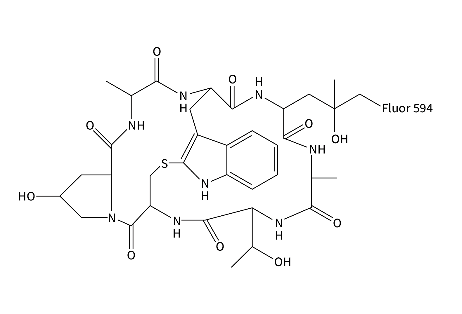 Phalloidin is a cyclic heptapeptide toxin derived from the death cap mushroom (Amanita phalloides). It selectively binds to filamentous actin (F-actin) with high affinity (Kd = 20 nM) and does not bind to globular actin (G-actin). Phalloidin is commonly used to label F-actin in tissue sections, cell cultures, or cell-free systems, allowing for qualitative and quantitative analysis of F-actin.Phalloidin derivatives also bind to both thick and thin filaments with similar affinity, regardless of whether they are from animal or plant muscle cells or non-muscle cells. The binding ratio is approximately one phalloidin molecule per actin subunit. Non-specific binding is negligible, and the contrast between stained and unstained regions is very distinct. Therefore, phalloidin derivatives are particularly suitable for replacing actin antibodies in related research.Additionally, phalloidin derivatives are very small, with a diameter of about 12–15 Å and a molecular weight of less than 2000 Daltons. Many physiological properties of actin are maintained when it is not labeled. For example, interactions with actin-binding proteins such as myosin, tropomyosin, and DNase I are still possible. Phalloidin-labeled filaments can still penetrate solid-phase myosin matrices, and glycerol-extracted muscle fibers can still contract after labeling.