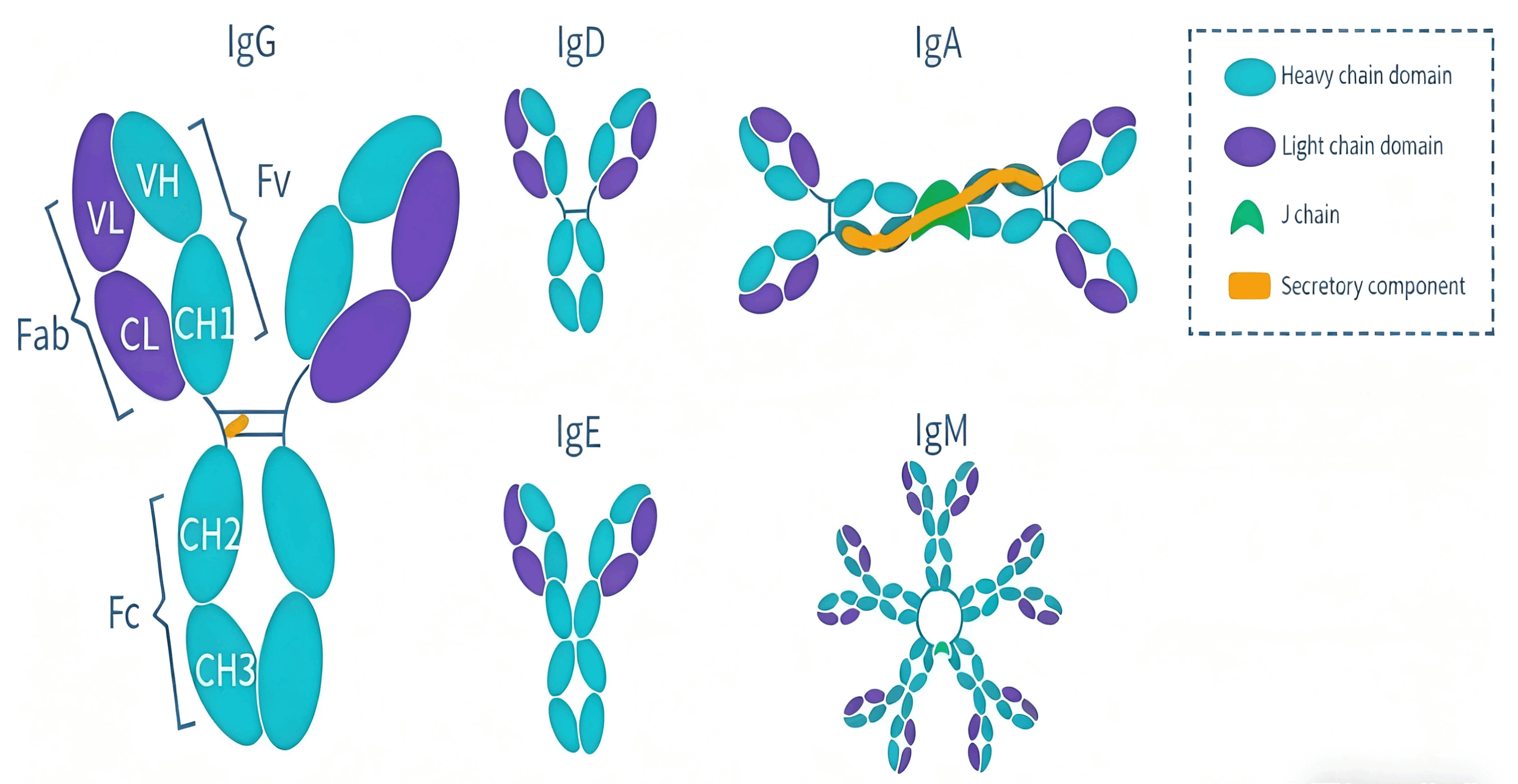 IgM is the first immunoglobulin expressed during B cell development and the primary antibody in the primary immune response, with a molecular weight of approximately 900 kDa. It can exist in either monomeric or pentameric forms: the monomeric form binds to the surface of B cells, while the secretory form is a pentamer linked by disulfide bonds and a J chain. The pentameric structure enables IgM to bind to antigenic epitopes efficiently. However, it is only of limited use in assays (such as immunohistochemistry) that require signal amplification, and may exhibit the effect of macromolecular steric hindrance. Moreover, compared with IgG, IgM is mainly produced in the early stages of the immune response, has lower affinity, and is more difficult to purify and isolate.