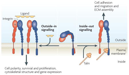 Integrins are α/β heterodimeric cell surface receptors that play a pivotal role in cell adhesion and migration, as well as in growth and survival. The integrin family contains at least 18 α and 8 β subunits that form 24 known integrins with distinct tissue distribution and overlapping ligand specificities. Integrins not only transmit signals to cells in response to the extracellular environment (outside-in signaling), but also sense intracellular cues to alter their interaction with the extracellular environment (inside-out signaling).