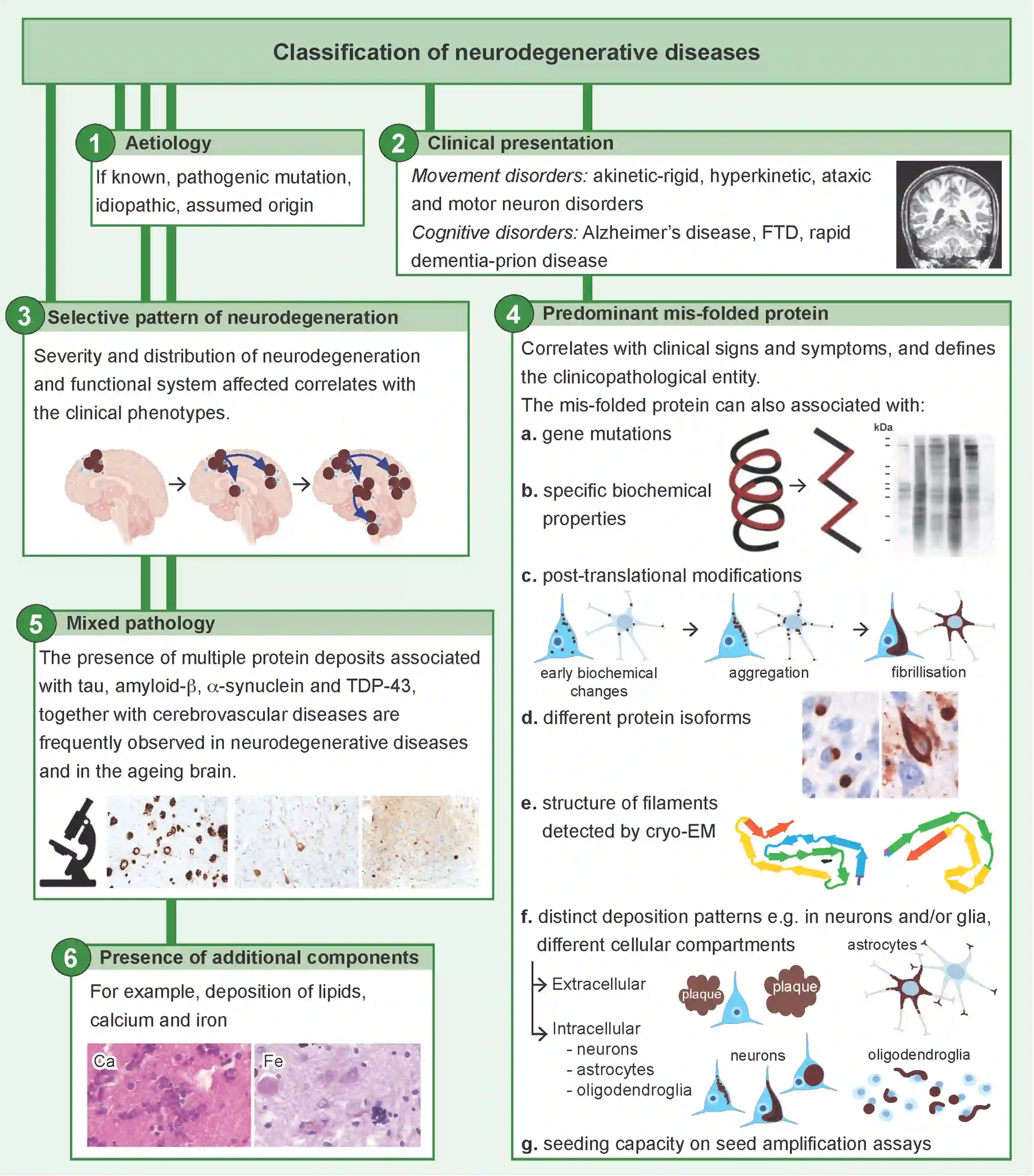 Neurodegenerative diseases are characterised by selective dysfunction and loss of synaptic connectivity and neurons. Dysfunction of glial cells, including astroglia, oligodendroglia and microglia, may have primary roles, or come secondary to neuronal degeneration, or contribute to neuronal degeneration. Neurodegenerative diseases are also characterised by the deposition of conformationally altered variants of physiological proteins in the nervous system that abnormally aggregate in neurons and/or glial cells. The severity and distribution of selective neurodegeneration and functional system affected correlate with the diverse clinical phenotypes observed in patients. In addition, within the same neuropathological entities, anatomical, cytopathological and molecular heterogeneities exist and contribute to the diverse clinical phenotypes observed. Neurodegenerative diseases are traditionally distinguished by the following histological features: