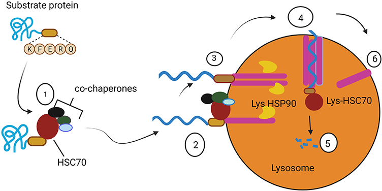 Chaperone-mediated autophagy (CMA) is a process triggering the lysosomal-mediated degradation of specific protein targets. CMA is induced by a variety of stresses, including starvation, genotoxic insults, oxidative stress, and hypoxia. CMA upregulation has been linked to the survival and proliferation of cancer cells, while deficiencies in CMA have been described in many neurodegenerative pathologies. The mechanism of CMA is a multi-step process involving substrate recognition, trafficking to the lysosome, and degradation. Substrate recognition involves binding of target proteins containing a penta-peptide KFERQ, or KFERQ-like motif, to the cytosolic chaperone protein heat shock cognate protein 70 (HSC70), also called HSPA8 or HSP73. With the help of additional co-chaperones, including HSP90, HSP40, HOP, HIP, and BAG1, the HSC70-substrate complex is targeted to the lysosomal membrane where it interacts with lysosomal-associated membrane protein 2A (LAMP2A). LAMP2A is one of three splice variants of LAMP2 differing in a small carboxyl-terminal cytoplasmic tail. This region is required for lysosomal docking of HSC70–substrate complexes. Changes in LAMP2A expression through transcriptional regulation or protein stability factor in the regulation of CMA.