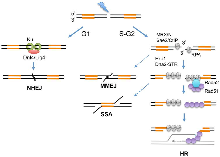 DNA double-strand breaks (DSBs) can form as a consequence of normal cell metabolism or by action of exogenous agents, such as ionizing radiation (IR) or chemotherapeutic drugs. Typically, DSBs are repaired by an end joining mechanism or by homologous recombination (HR). Non-homologous end joining (NHEJ) involves the direct ligation of DNA ends with little or no homology and is generally considered to be an error-prone process because nucleotides can be lost or gained at the ends prior to ligation. One form of alt-NHEJ involves alignment of ends through very short sequence homologies (generally<18 nt) internal to the ends that are revealed by end resection and is termed microhomology-mediated end joining (MMEJ). If long (>200 bp) direct repeats flank the DSB, then repair can occur by annealing of the complementary 3′-ssDNA tails formed by end resection in a mechanism referred to as single-strand annealing (SSA). In several respects SSA and MMEJ are similar, they differ by the extent of sequence homology and requirement for a dedicated annealing protein for SSA (Rad52) resulting in a higher efficiency of repair than MMEJ. HR requires a homologous DNA duplex as a template for repair of the broken chromosome, and consequently HR is restricted to the S and G2 phases of the cell cycle when a sister chromatid is present and kept in close proximity by Cohesin.