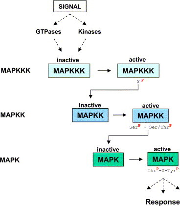 MAPKs transmit signals in the form of sequential phosphorylation events. The phospho-relay system is composed of three kinases: a MAPK kinase kinase (MAPKKK), a MAPK kinase (MAPKK) and a MAPK. Phosphorylation of the MAPKs occurs on a conserved dual-phosphorylation domain (Thr-Xxx-Tyr) leads to activation of the protein and the subsequent formation of dimers which translocate into the nucleus to activate downstream targets. Three major subfamilies of MAPK proteins have been defined: extracellular signal regulated kinases (ERK), the c-Jun amino-terminal kinases (JNK), and the p38 MAP kinases. The middle amino-acid residue of the conserved Thr-Xxx-Tyr dual-phosphorylation domain designates a MAPK protein to one of these subfamilies. In general, the ERK subfamily (TEY) is mainly activated by growth factors, p38 (TGY) by stress factors and JNK (TPY) are activated by stress-, differentiation- and growth-factors. It should be stressed here that scaffold proteins play an important role in the spatial–temporal organization of signaling complexes leading to activation of a specific cascade.