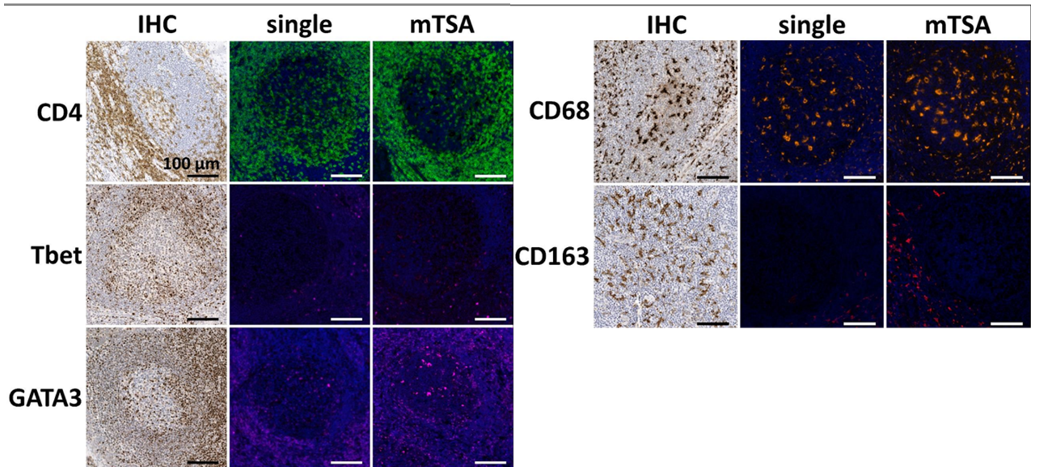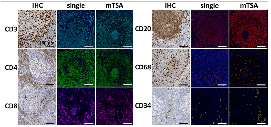 If target epitopes co-localize, tyramide deposition may interfere with each other. To detect this spatial hindrance inhibition, the study used control tonsil tissue sections and stained them with the mTSA detection combination. Antibody expression in mTSA was compared with single-stained sections that underwent the same number of boiling retrieval cycles. As shown in the results above, no difference in staining patterns was observed between single-stained sections and multiplex-stained sections.
