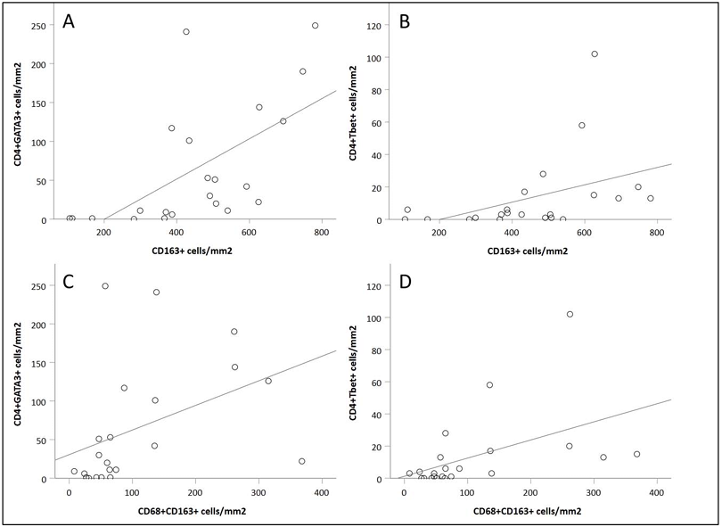 In biopsy samples at 6 weeks post-transplantation, the strongest correlation was observed between CD4⁺GATA3⁺ cell density and CD163⁺ cell density (Figure A). In contrast, the correlation between CD4⁺Tbet⁺ cell density and CD163⁺ cell density was weaker (Figure B). When the cell population was limited to double-positive macrophages (CD68⁺CD163⁺), a significant correlation was still maintained with CD4⁺GATA3⁺ cell density. In addition, a correlation was also observed between CD4⁺GATA3⁺ cell density and CD20⁺ cell density. The correlation between CD4⁺Tbet⁺ cell density and CD20⁺ cell density was weaker. A significant correlation was observed between CD3⁺CD8⁻ cell density and CD3⁺CD8⁺ cell density.