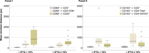 No significant differences were observed between the two groups of patients in the average shortest distances between CD68⁺ cells and CD3⁺, CD3⁺CD8⁺, and CD20⁺ cells, as well as between CD163⁺ cells and CD4⁺, CD4⁺Tbet⁺, and CD4⁺GATA3⁺ cells. This indicates that these two indicators may not be related to short-term IFTA progression.