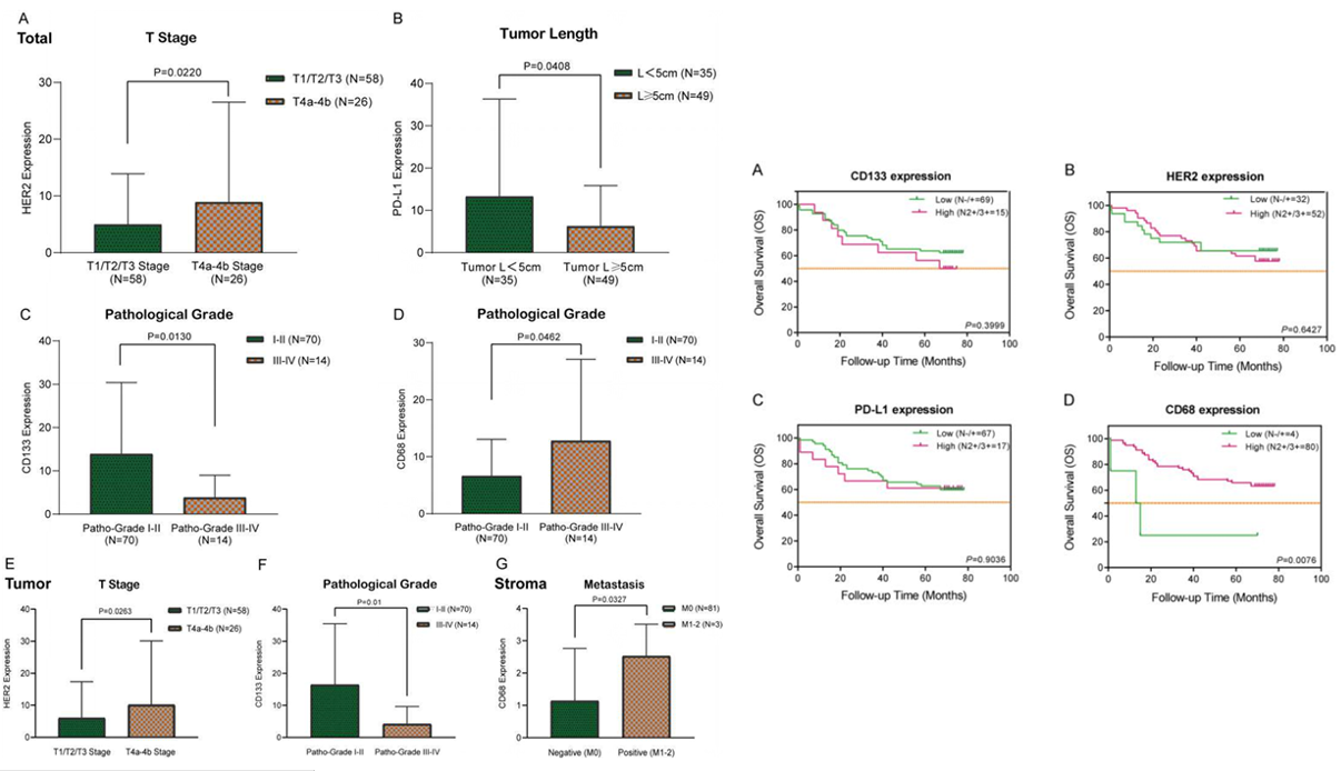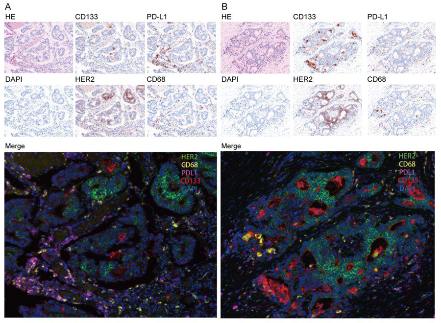 Combining core data on single-label marker expression differences, double-label marker combination expression differences, triple-label marker combination expression differences, and the association between markers and clinicopathological features, comprehensive analysis was conducted focusing on the single-label expression, combination expression characteristics of CD133, HER2, PD-L1, and CD68, and their association with clinicopathological features, to clarify the clinical value of each marker and combination.