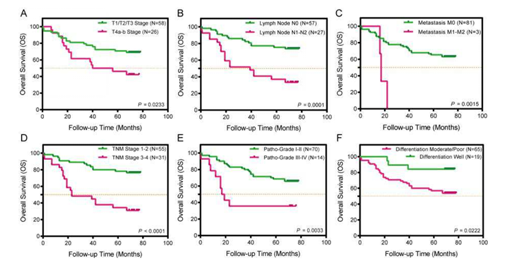 The Kaplan-Meier survival curve focuses on the 7-year overall survival (OS) of 84 colorectal cancer patients, systematically analyzing the prognostic value of 6 clinicopathological features: T stage, lymph node metastasis, distant metastasis, TNM stage, pathological grade, and differentiation degree. The orange dashed line in the figure represents 50% overall survival rate. Figure A shows T stage, B shows lymph node metastasis status, C shows distant metastasis status, D shows TNM stage, and E and F show pathological grades. This figure clearly demonstrates that the prognosis of colorectal cancer patients is closely related to the degree of tumor progression, providing a clinical basis for subsequent analysis of the association between biomarkers and prognosis.