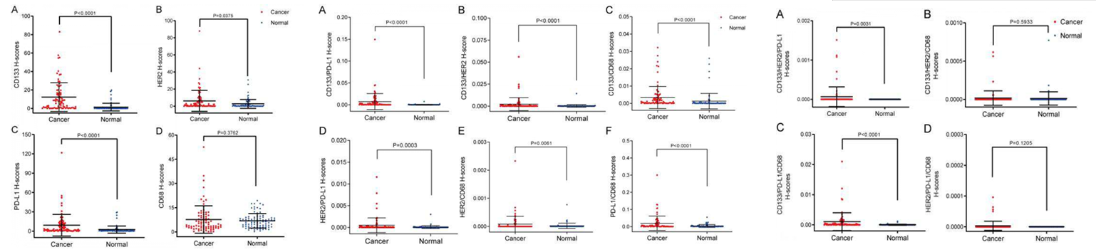 In terms of marker combinations, all six double-label combinations show significantly higher expression in cancer tissues than in normal tissues, with the most significant differences in the combinations of CD133 with PD-L1, HER2, CD68, and PD-L1 with CD68, suggesting synergistic expression relationships between markers. Among the four triple-label combinations, only CD133/HER2/PD-L1 and CD133/HER2/CD68 show significant expression differences, indicating that combinations centered on CD133 and HER2 have greater diagnostic potential.