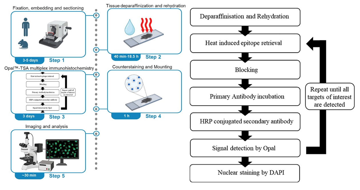 Opal-TSA multiplex immunofluorescence (mIF) technology, with its high sensitivity and staining flexibility, has become an ideal choice to break through these bottlenecks. The literature "Protocol for investigating tertiary lymphoid structures in human and murine fixed tissue sections using Opal-TSA multiplex immunohistochemistry" centers on Opal-TSA multiplex immunofluorescence technology, constructing a standardized research protocol for TLSs in human and mouse tumor tissues. As key ectopic lymphoid aggregates in the tumor microenvironment, the precise identification and functional characterization of TLSs are crucial for tumor immunity research. Through the innovative application of mIF technology, this literature provides a reliable path to solve technical bottlenecks in TLSs research.