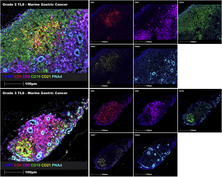 To verify the cross-species adaptability of the protocol, the article simultaneously presents mIF images of mouse gastric cancer tissue sections using six-color labeled Opal-TSA. The image results show accurate identification and classification of TLSs maturity in mouse tissue sections, including immune cell infiltration, immune cell aggregation, immature TLS, and mature TLS. Similarly, Grade 2 and Grade 3 TLS can also be successfully identified in mouse gastric cancer tissue sections through manual staining.