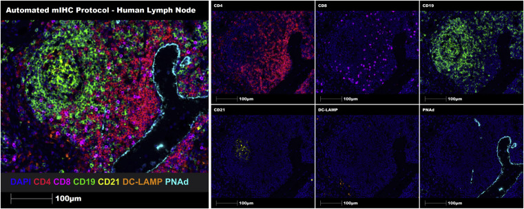 Through seven-marker Opal-TSA technology, multiplex staining was performed on representative human lymph node FFPE tissue sections. Both manual and automated staining successfully identified and characterized immune cell aggregates and TLSs on FFPE tissue sections.
